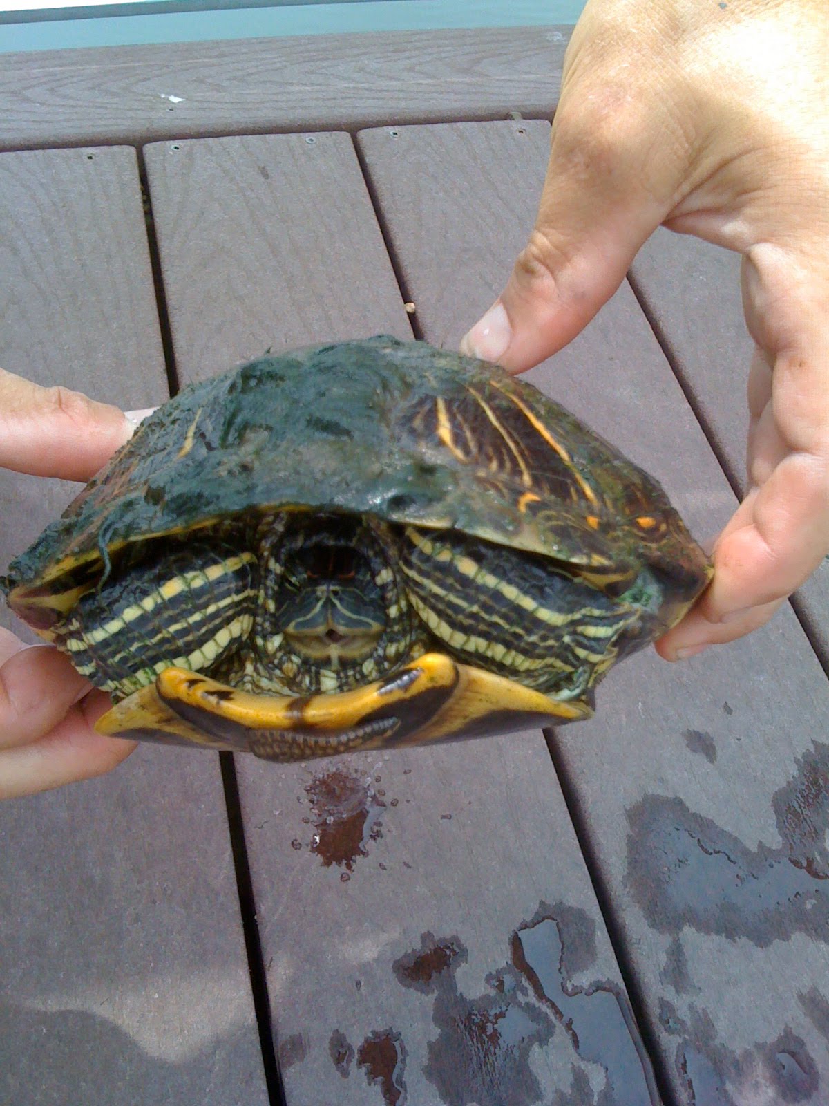 Check out this big turtle. He's got some crazy looking leeches on his back and belly.